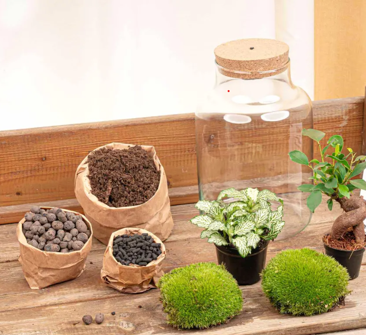 - Musgo, tierra, arena decorativa y piedras